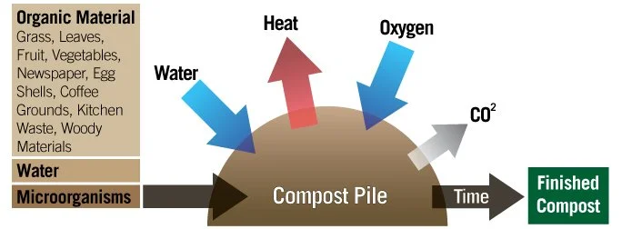 Composting is nature’s way of recycling, and it works by breaking down organic waste like grass clippings, leaves and kitchen waste into smaller and smaller compounds until it becomes soil again. Composting is the easiest way to put nutrients back into your yard and gardens, without fertilizers! By combining nitrogen, carbon and oxygen, organic materials break down into nutrient-rich soil. The following drawing illustrates how composting works:
